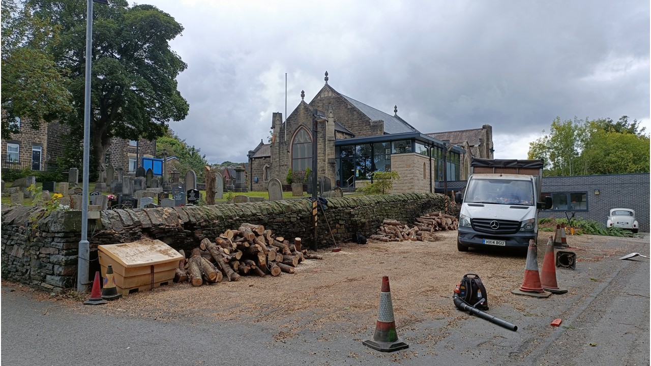In this age of being environmentally conscious, we are sorry that we have been forced to take down the trees between the church graveyard and the car park. They were starting to become dangerous by damaging the retaining wall and impacting on adjacent graves. But, out with the old and in with the new. Once the ground has settled and the stumps rotted down we intend to plant new native trees to replace the “imported” leylandii trees. We hope to use flowering cherry trees and maybe some other fruiting trees that can provide fruit for our lunch club in the future.