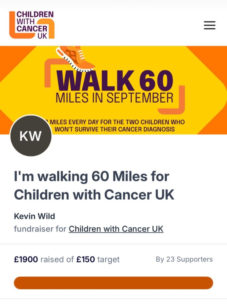 A huge congratulations to Kevin Wild on not only completing the “Walk 60 Miles” Challenge, but actually doubling the milage. He has raised an amazing £1900 for the charity.
