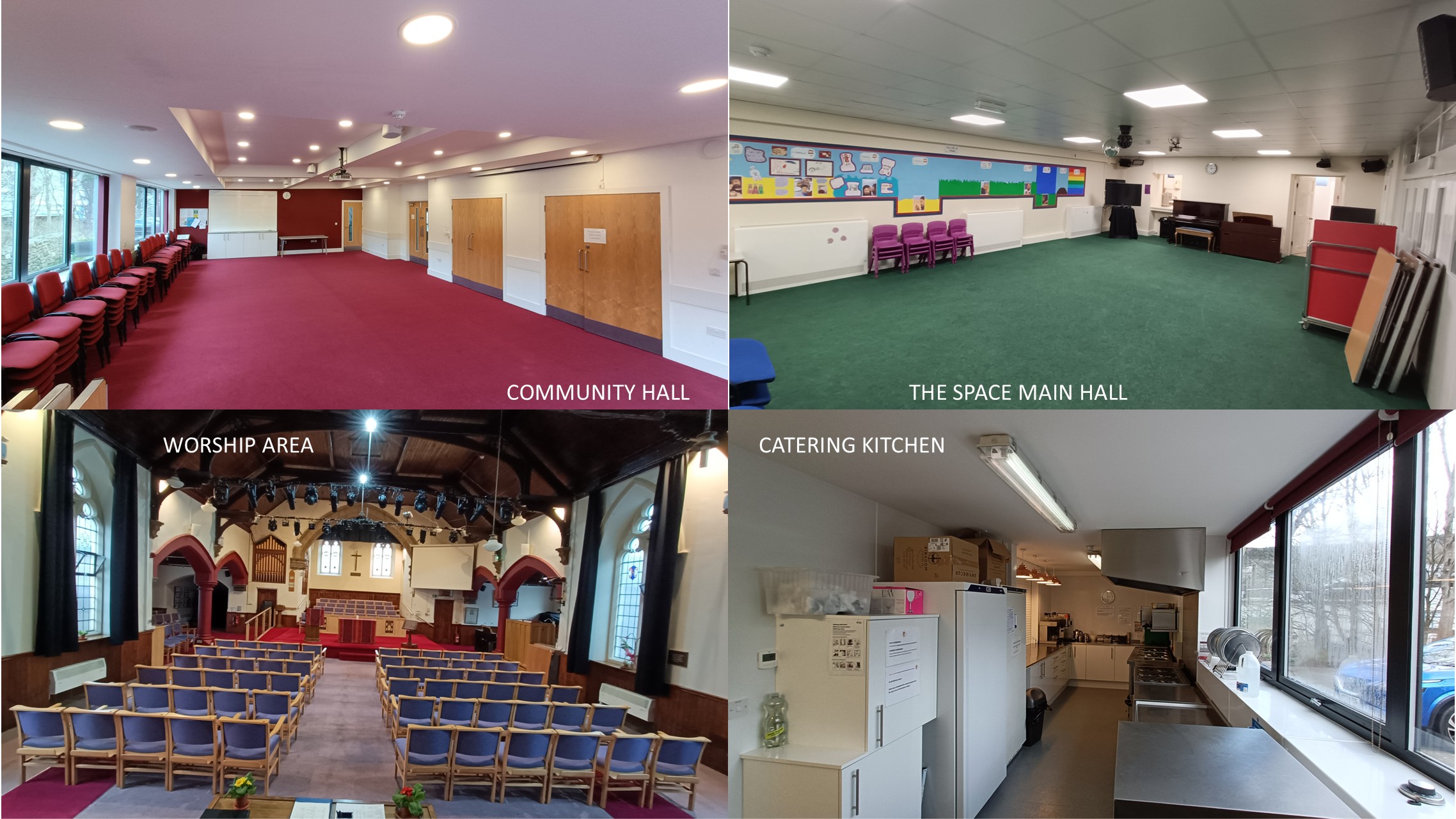 There is disabled access to all floors via a lift from the Lower Ground Floor. A large CCTV Monitored car park gives direct access to the lower ground floor where The Community Hall and The Space are located. A lift gives access to the ground floor Worship Area space