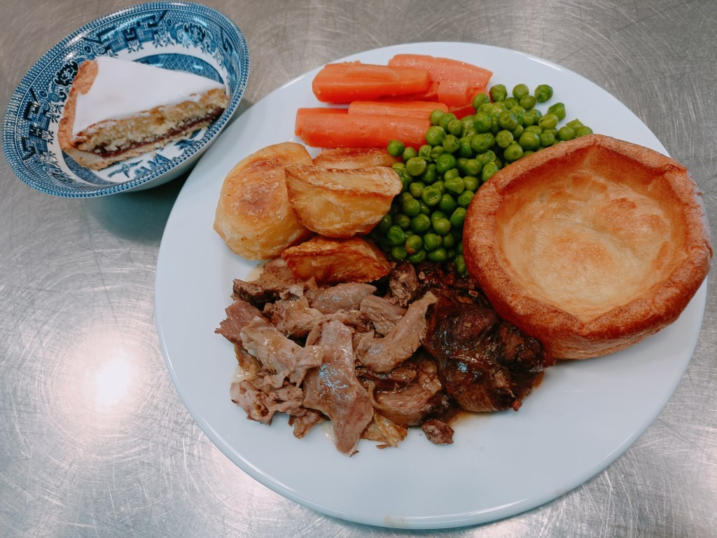 Roast Lamb, Yorkshire pud, roast potatoes, glazed carrots and buttered peas with home made Bakewell Tart to follow.