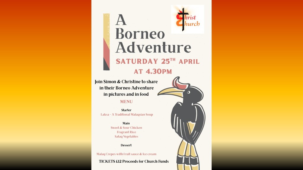 Simon & Christine Utting share their experiences in Borneo in pictures and food. Tickets £12 raising money for funds for church.